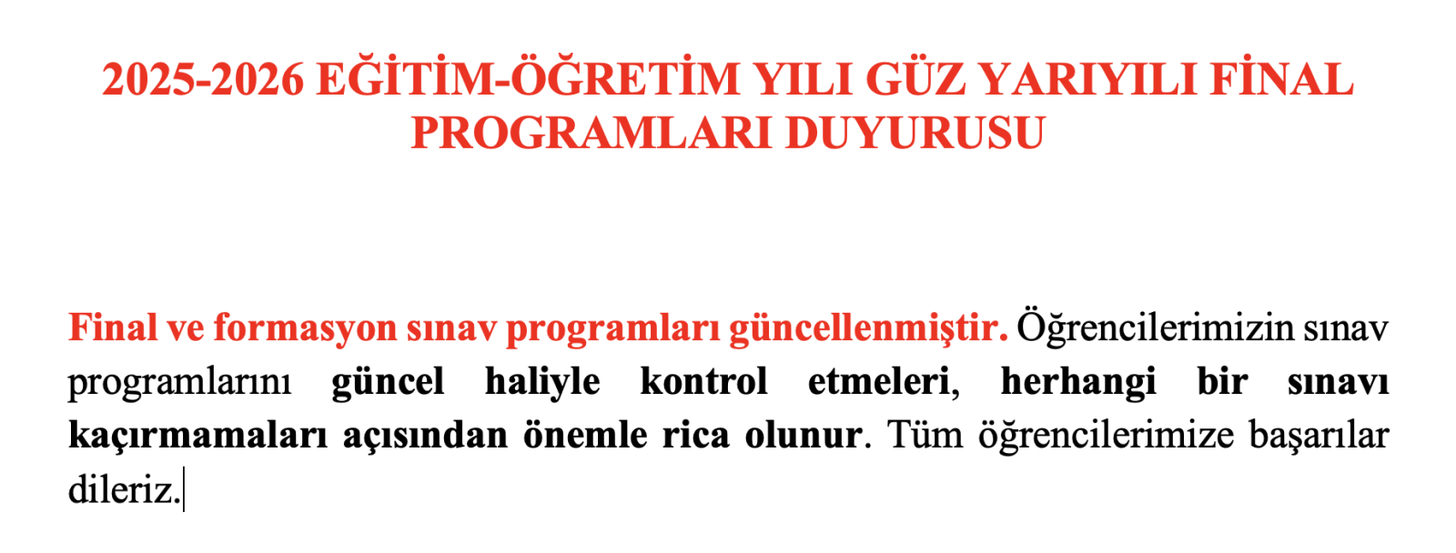 2025-2026 EĞİTİM-ÖĞRETİM YILI GÜZ YARIYILI FİNAL SINAV PROGRAMI